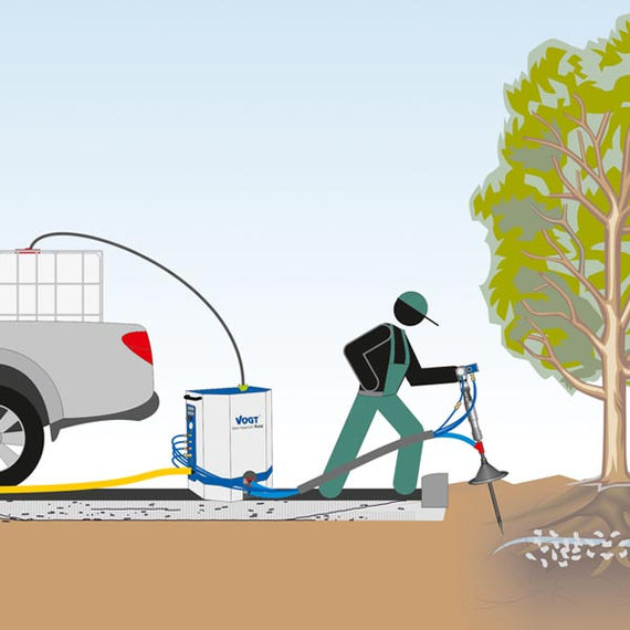Die Bodenbelüftung erfolgt über einen 20 Liter Pufferspeicher. Nach der Lockerung wird das Fluid mit einem Druck zwischen 2 und 10 bar schonend über einen separaten Schlauch in das Erdreich eingebracht. Dieser Vorgang kann individuell nach Bedarf in verschiedenen Tiefen ausgelöst werden. Die pneumatische Ein-Mann-Bedienung direkt an der Injektionseinheit ermöglicht ein flexibles Arbeiten im Umkreis von 10 Metern um die Versorgungseinheit. Die lnjektionsmenge wird via Zeitventil eingestellt, um gleichmäßige Mengen einzubringen. Die Ansaugung erfolgt über einen 3,3 Meter langen Saugschlauch und ermöglicht den Betrieb auch mit großen Vorratsbehältern (z.B. IBC-Container). Eine pneumatische Umwälzfunktion vermeidet ein Absenken der Suspension. Das kompakte Gerät kann mittels Adapterplatte an den Vorratsbehälter bzw. an die optional erhältliche Arbeits- und Transporteinheit adaptiert werden. Die Technik ist optional für nicht europäisches Ausland auch nach ASME-Norm erhältlich. Der Geräte-Betriebsdruck ist auf 10 bar ausgelegt.